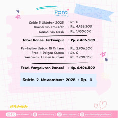 Terimakasih kepada seluruh donatur yang telah menyisihkan sebagian rezekinya melalui pantibekasi.org.