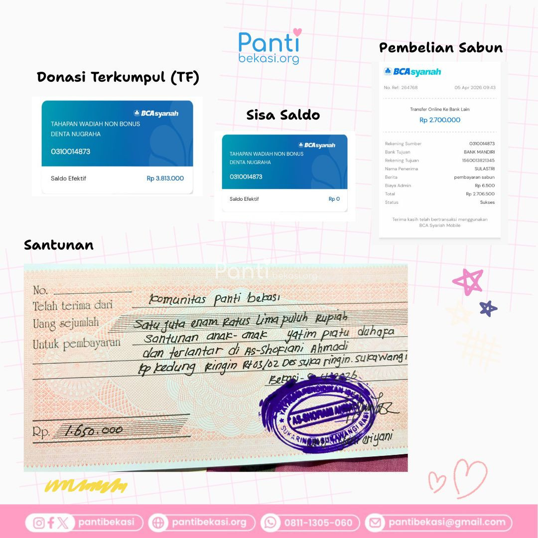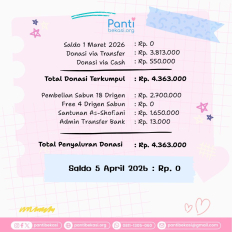 Terimakasih kepada seluruh donatur yang telah menyisihkan sebagian rezekinya melalui pantibekasi.org.